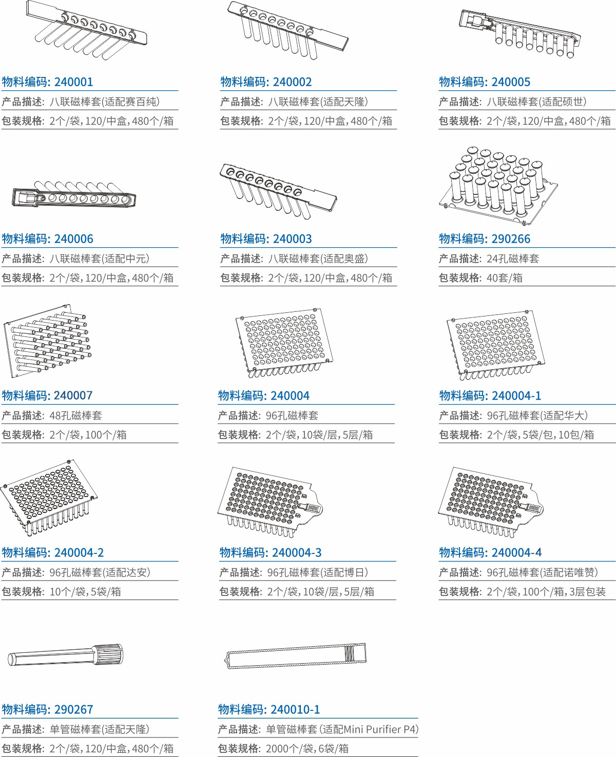 ※ 医疗级聚丙烯(PP)材质,良好的化学抗性,保护磁棒不易受损 ※ 对生物分子吸附性低 ※ 无RNA酶、无DNA酶、无基因组DNA,无热源 ※ 兼容于市面上主流的磁珠法核酸提取仪