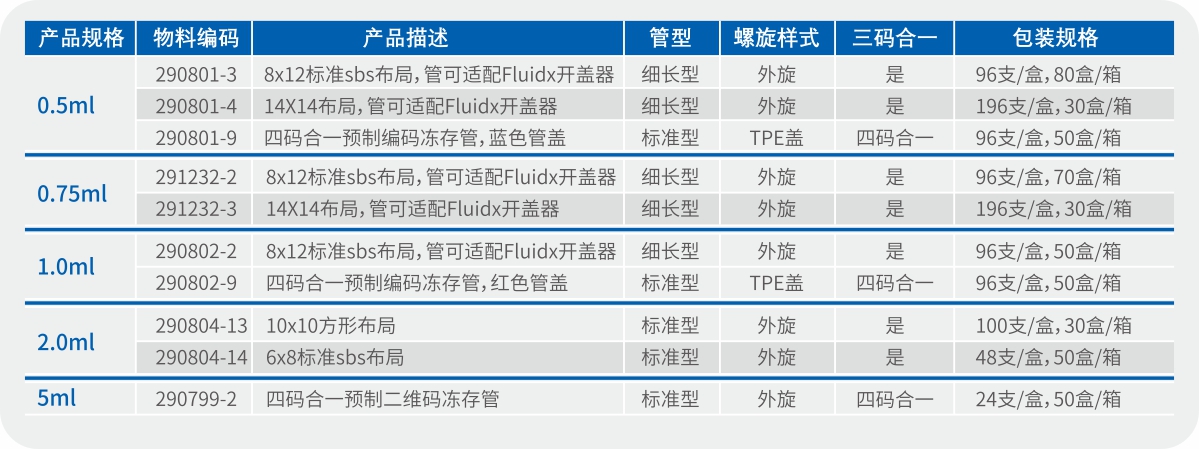 ※ 无细胞毒性、无热原、无DNA/RNA酶、内毒素含量<0.005EU/ml ※ ANSI/SLAS国际标准,适配多种自动化存储及处理设备 ※ 激光蚀刻工艺,三码信息合一,确保样本数据安全冗余 ※ 底座式卡扣设计,开启便捷,避免结霜后开盖划伤 ※ 精密结构设计,-98kpa下无泄漏,符合IATA PI650标准