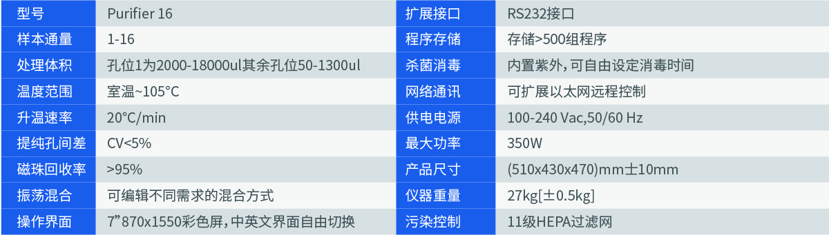 ※ 独特设计的七孔试剂条,第一孔最高处理体积可达18ml,其余孔位最低处理体积可到 50ul,实现了样本核酸的高度富集。 ※ 封闭式操作舱,内设有HEPA过滤系统和紫外灯,有效降低气溶胶污染。 ※ 七孔试剂条,独立放置,可降低样本间的交叉污染风险。 ※ 10英寸大显示屏,操作界面简单,预装运行程序,可实现一键运行。 ※ 试剂可预装,简便灵活,只需加入样本即可,减少人工操作环节,省工省时,适配市面上大部分磁珠法核酸提取试剂。 ※ 采用丝杆传动实现升降运动,精度高,更稳定;采用伺服电机控制技术,运行噪音低更精确。