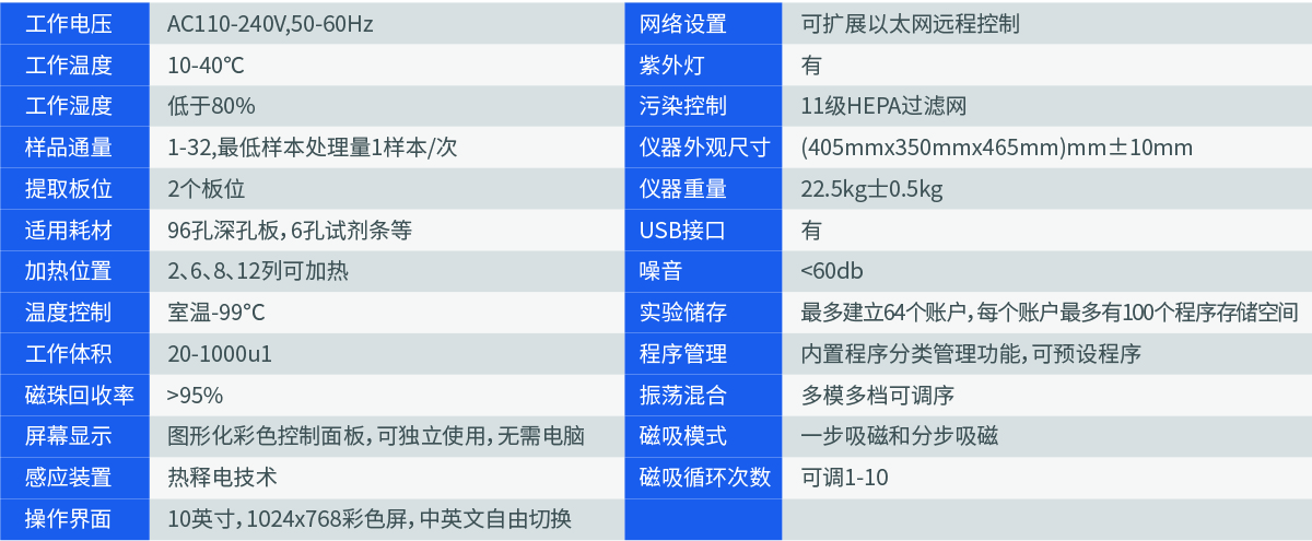 ※ 智能循环磁吸功能,显著降低体系的磁珠残留量 ※ 可拆卸磁棒,便于维修和更换,延长仪器使用寿命 ※ 多档多模可调,可满足不同实验需求 ※ 采用包裹性强的深空加热条,减少设定温度和实际温度误差 ※ 具有紫外杀菌装置和11级HEPA高效空气过滤网,有效降低气溶胶污染 ※ 采用Linux系统中英文界面可轻松切换 ※ 可以根据提取类型保存程序,便于寻找